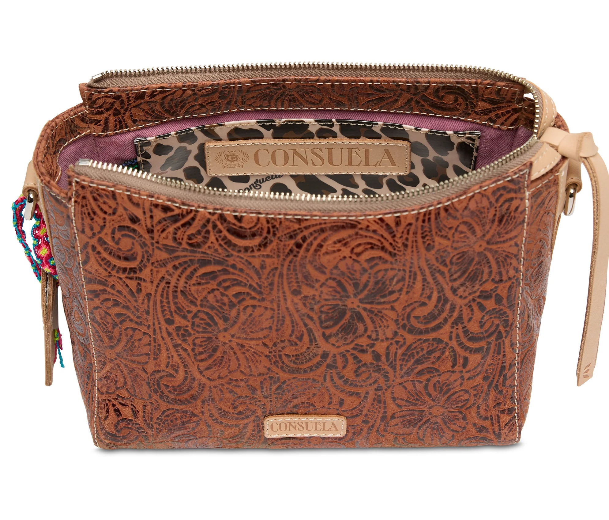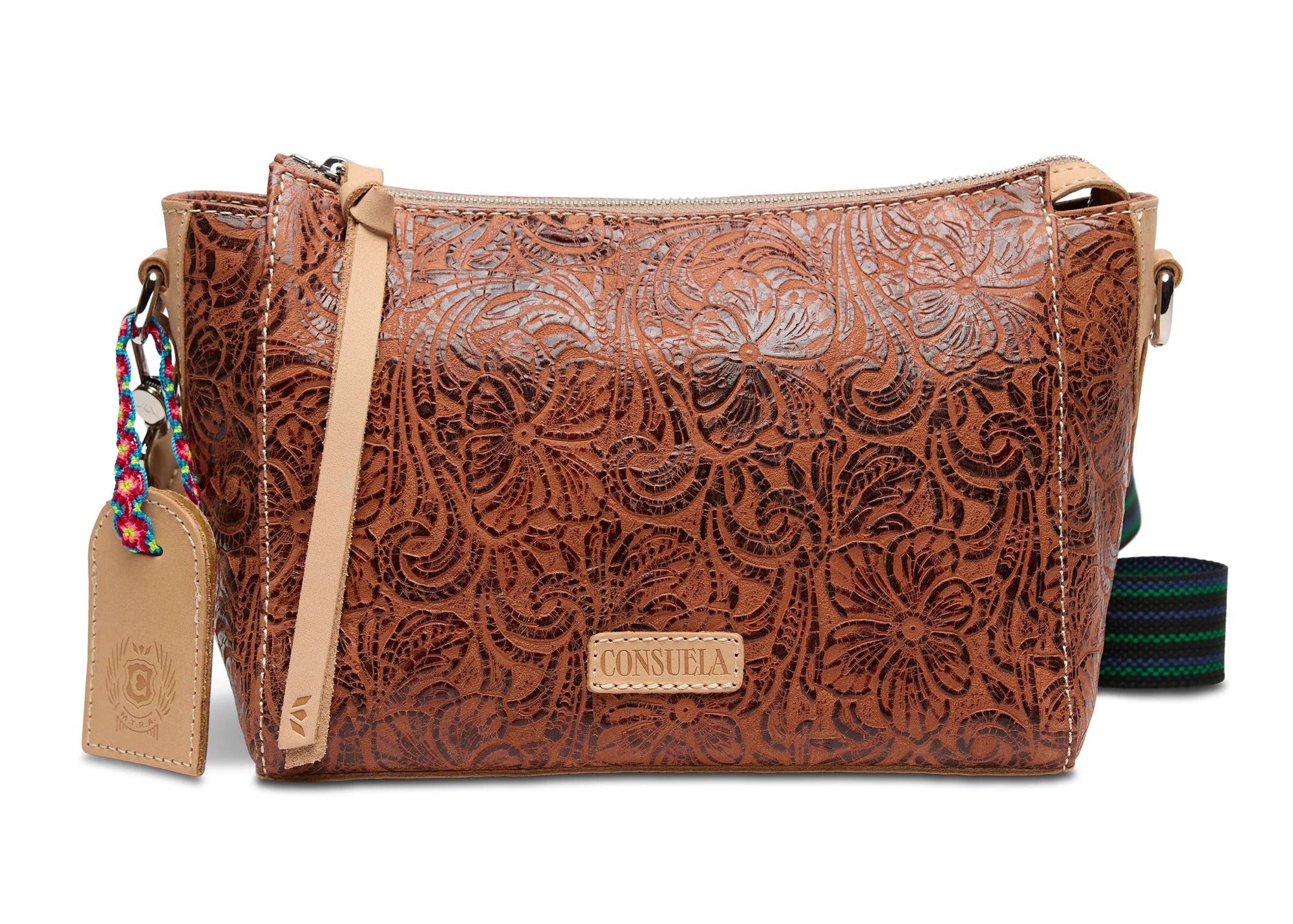 - Includes detachable and adjustable woven crossbody strap