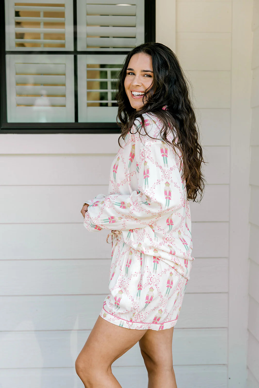 -Pink piping on collar, sleeve cuffs, and bottom of shorts