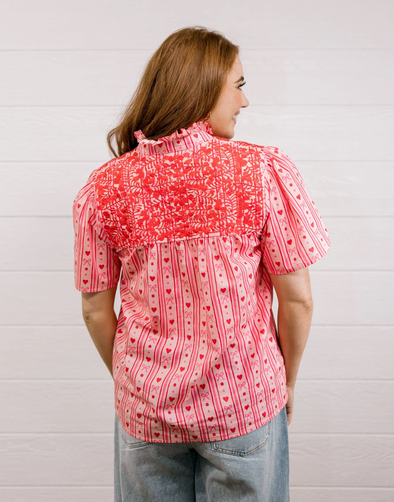-Short sleeve pink blouse with ruffle collar